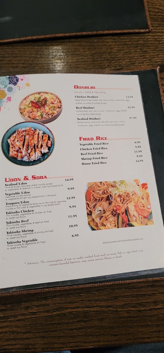 The sizzling Hibachi section, featuring Hibachi Shrimp, Hibachi Combo, Hibachi Filet Mignon, Hibachi Steak, and Hibachi Chicken, emphasizes bold flavors and generous portions. Noodle enthusiasts are well served with Udon & Soba dishes like Yakisoba Vegetable, Yakisoba Shrimp, Yakisoba Chicken, Tempura Udon, and Seafood Udon, while the Fried Rice selection ranges from Vegetable Fried Rice to House Fried Rice, Chicken Fried Rice, Beef Fried Rice, and Shrimp Fried Rice.