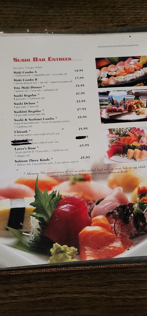 1 salmon roll, 3 pcs salmon sushi, 5 pcs salmon sashimi. Advisory: The consumption of raw or undercooked food such as meat, fish, or egg which may contain harmful bacteria, may cause serious illness or death.